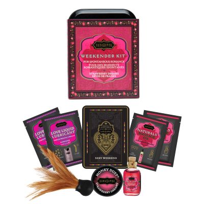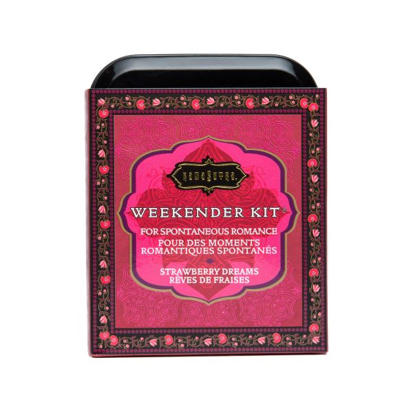 Kit de viaje Weekender de Fresa. Un estuche con los productos favoritos del Kama Sutra para un románce espontáneo. Incluye: Aceite del Amor Sueños de fresa de 5 ml, Bálsamo del Placer Sueños de fresa de 3.5 ml, Polvo de Miel de fresa de 3.5 g; además Aceite de masaje Almendra Dulce 6 ml y Líquido del Amor 6 ml. Seguro para preservativos. Dermatológicamente probados. Para uso externo. Todo en una linda caja de viaje que cabe en un tu bolso